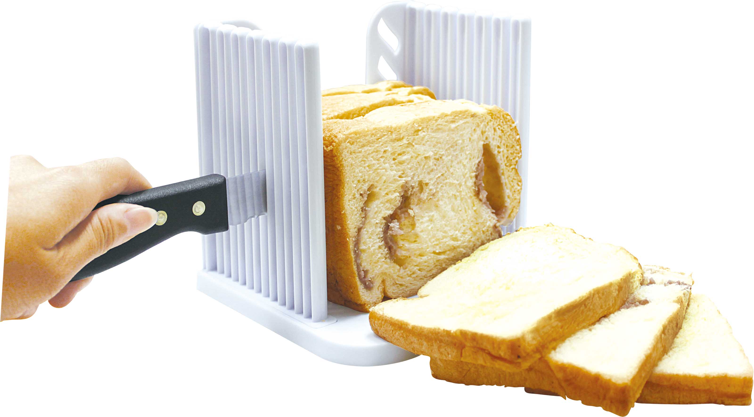 Easily slice toast and hamburger buns to perfect thickness.Made of high-quality HIPS plastic, non-toxic and durable, compact and portable, detachable for easy cleaning, allowing you to easily slice even bread slices at home.