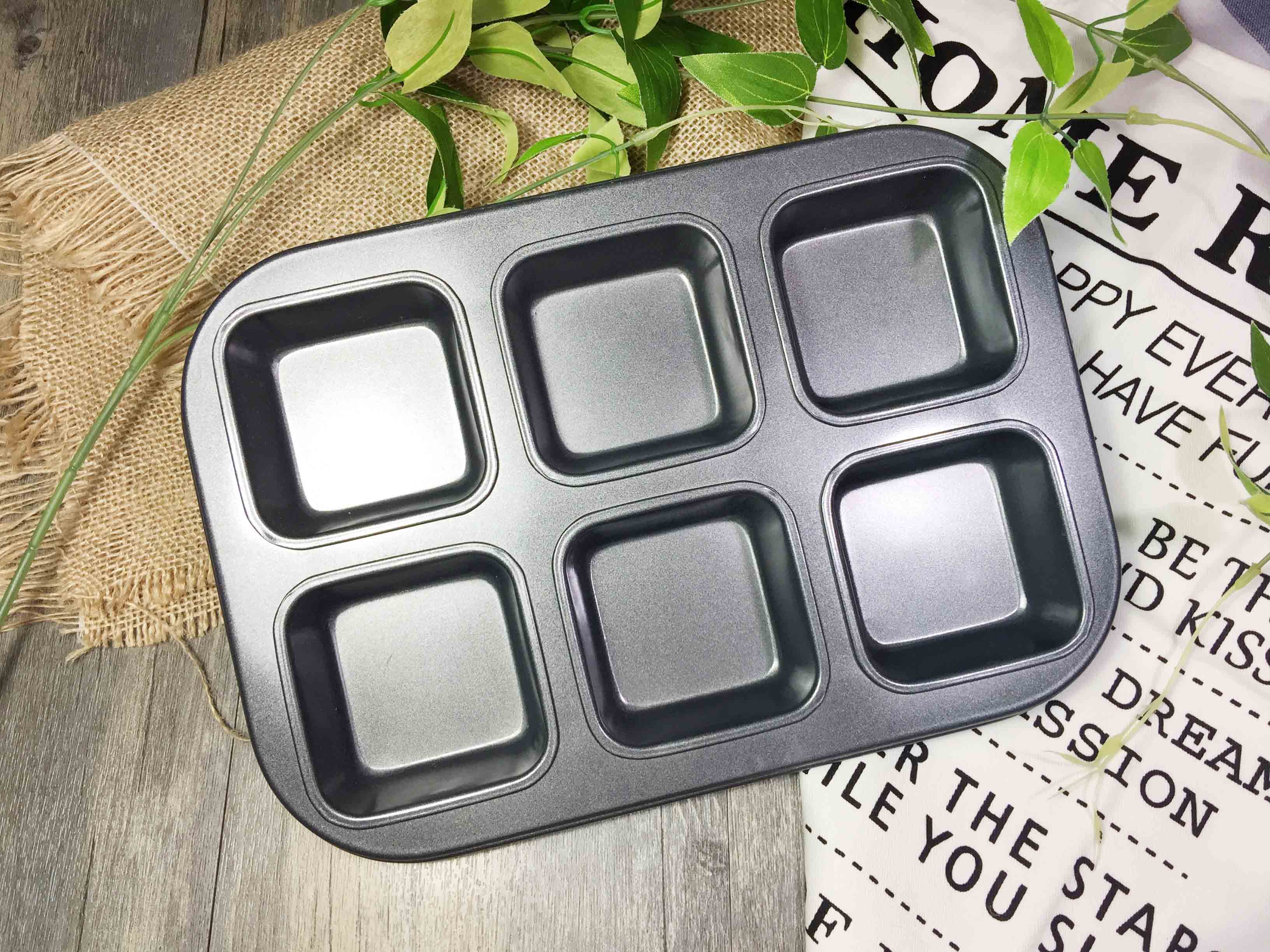 This square, six-cavity baking pan is made of high-carbon steel with a silicone non-stick coating, ensuring even heat distribution, rapid heat release, and easy cleaning. It is BPA and PFOA free and can withstand temperatures up to 220°C, making it ideal for baking square loaves of bread, egg tarts, Yorkshire pudding, chiffon cakes, and other desserts.