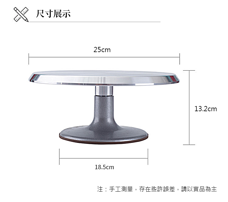 Stable, smooth, and essential for professional decorating.Made of high-quality aluminum alloy, featuring a non-slip base and rubber feet, ensuring smooth, 360° rotation. Suitable for both left- and right-handed users, perfectly supporting cake and cupcake decorating.
